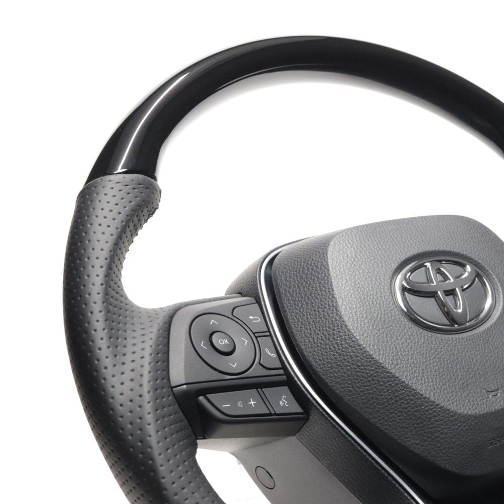 レアル製ステアリングは、カーボン35層、ウッド(カラー)8層、プリント5層の硬皮膜クリア塗装を施しています。