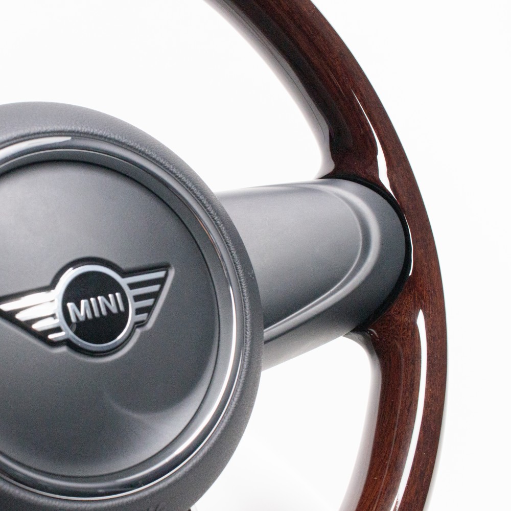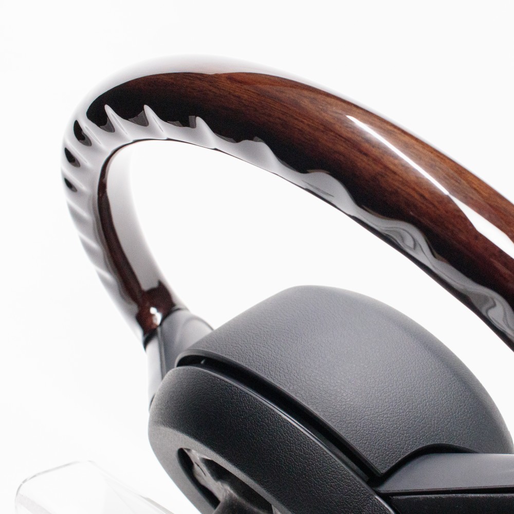 厚さ1ミリ程度に切り出したスライスウッドを重ね、圧着し、ステアリング形状にしています。その上に12層のクリア塗装を施しています。