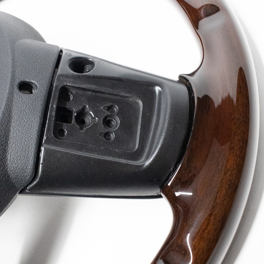 レアル製ステアリングは、カーボン35層、ウッド(カラー)8層、プリント5層の硬皮膜クリア塗装を施しています。
