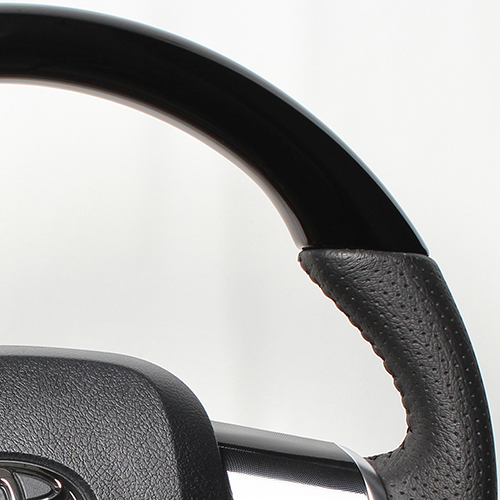 レアル製ステアリングは、カーボン35層、ウッド(カラー)8層、プリント5層の硬皮膜クリア塗装を施しています。
